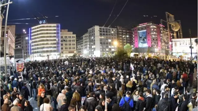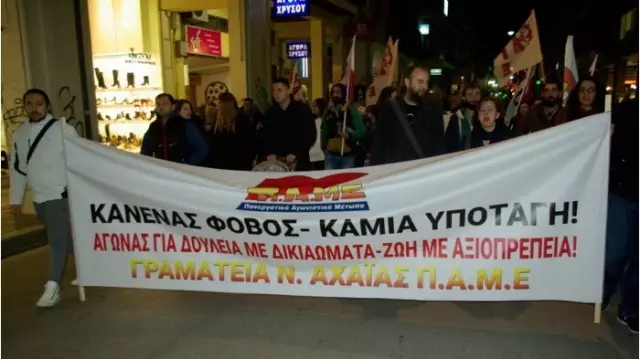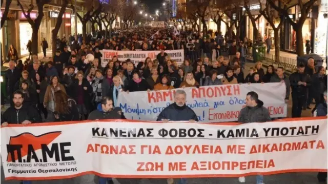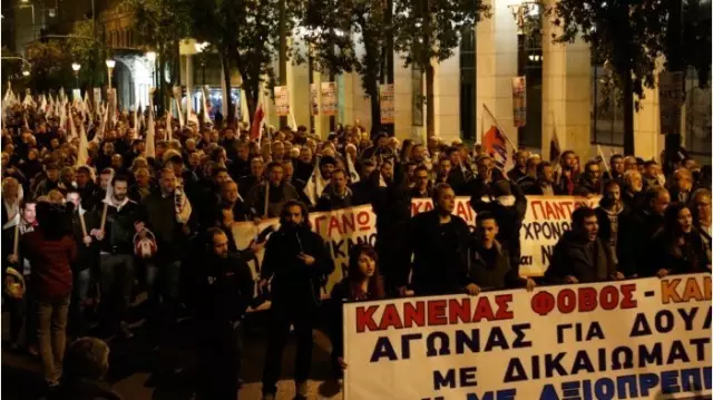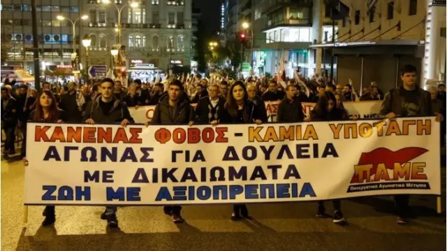 在雅典奥莫尼亚广场,在“全体工人战斗阵线”的演讲台后面的旗帜上,写着传达动员信息的口号:“不要恐惧,不要投降,要为劳动权利和有尊严的生活而斗争。”