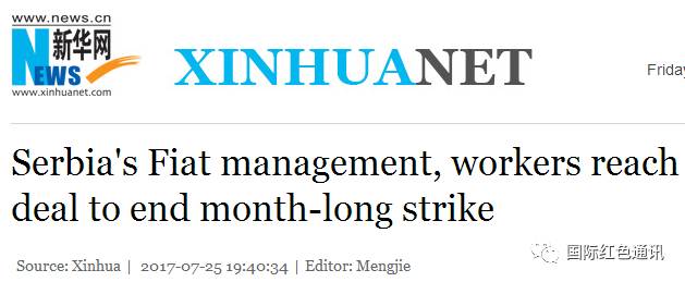 编者按: 2017年6月27日,“菲亚特克莱斯勒”塞尔维亚工厂的汽车制造工人发动了罢工,要求提高工资和改善工作条件。南斯拉夫新共产党发表了支持工人罢工的声明(点击蓝字可以查看)。经过一个月的斗争,该厂2000多名工人现已取得胜利,资方同意将工资提高近10%。我们翻译了路透社和新华社的两篇报道,供读者朋友们参考。