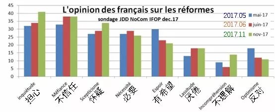 法国民调机构为《星期日报》和NOCOM新闻网在11月24日至28日进行的第三次公共调查的结果已经表明,法国民众对未来已经越来越感到悲观。在马克龙胜选6个月后,由其提出的一系列有利于富人而使得普罗大众利益极度受损的政策使法国民众感到失望。这些举措推行以来,已经有十分之六的法国人对未来工资预期持悲观态度。法国民众的心理同样因马克龙失败的政策的影响而大受打击,近一半的法国人对自己的未来已不再拥有信心。
