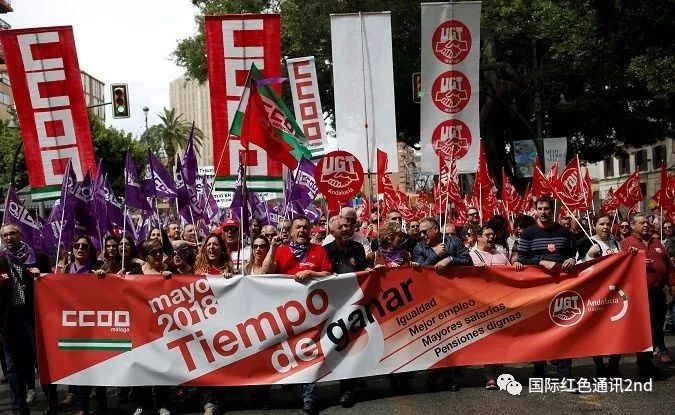 成千上万的人们走上街头,要求改善就业和养老金的状况。示威者们挥舞红色的工会旗帜,高喊“总罢工”的口号,走过马德里市政厅和西班牙中央银行,最后到达市中心的太阳广场(Sol Square)。抗议者们还挥舞紫色旗帜以支持女权运动。