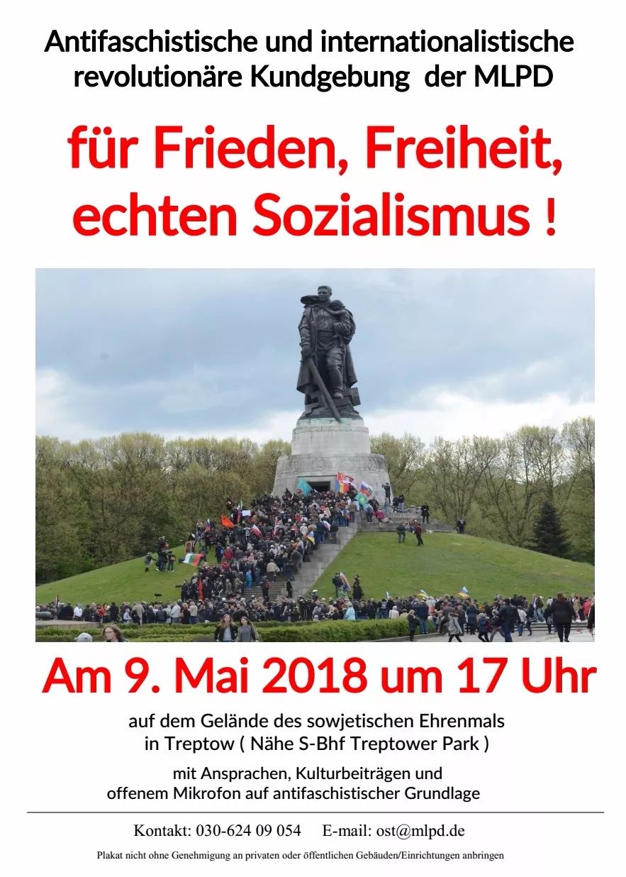 73年前的明天,1945年5月8日,希特勒法西斯独裁垮台了。这是人民从法西斯恐怖下解放出来的一天。社会主义苏联是反希特勒联盟中的主要力量。在柏林,每年特别在是5月9日,都有成千上万的人们来到特雷普托苏军战士纪念碑(Soviet War Memorial in Treptow)前。今年,德国马列主义党再次号召,于5月9日下午17时在苏军战士纪念碑前举行反法西斯和国际主义的革命集会。