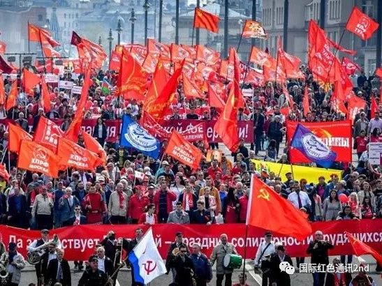 在全国500多个地方,有超过300万人举行了集会。图中是俄罗斯联邦共产党( Communist Party of the Russian Federation)在莫斯科组织的集会。