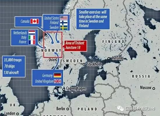 美国-北约军队成了二战后挪威领土上第一次出现的外国军队(译者注:2017年1月,300名美军进驻挪威)。这违背了我国的基本政策。挪威共产党要求跨越国界的裁军、团结与和平,并邀请你们参加反对“三叉戟接点”(Trident Juncture)演习的游行。明年北约将在挪威举行这一侵略性演习。这次北约演习的规模为20年之最,将有35000名士兵、几千辆战车、150架飞机和70艘军舰参加。