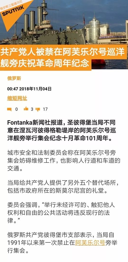 译者注:今年俄罗斯也有类似情况。据俄罗斯卫星通讯社消息,圣彼得堡当局禁止在阿芙乐尔号巡洋舰旁举行十月革命纪念活动。