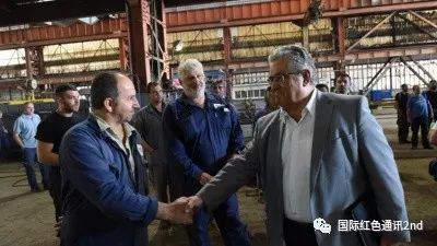 希腊共产党中央委员会总书记、议会党团主席季米特里斯·库楚巴斯看望埃列芬纳造船厂(Elefsina Shipyards)工人