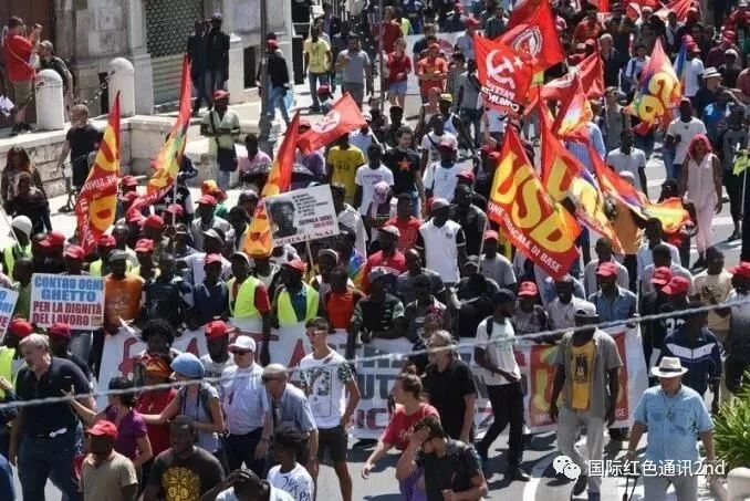 非洲农业工人在意大利示威,2018年8月。图中出现了共产党(意大利)和意大利共产主义青年阵线的旗帜。