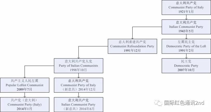 共产党人党、新意共: 1998年10月,意大利重建共产党发生分裂,当时支持中左翼政府的党员成立了意大利共产党人党[Party of Italian Communists,Partito dei Comunisti Italiani,简称PdCI]。意大利共产党人党2014年更名为意大利共产党[Communist Party of Italy,Partito Comunista d’Italia,即1921年至1943年意共的名称],2016年又与其他小组织合并为意大利共产党[Italian Communist Party,Partito Comunista Italiano,即1943年至1991年意共的名称]。该党一般被称为新意共。