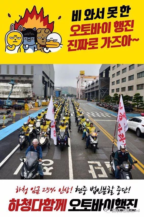 现代重工的劳动者们没有屈服,他们正在聚集起更多的力量。明天(5月29日),将有一场外包工人的摩托车大游行,他们提出将工资提高25%,并停止法人分割。当外包工人们克服恶劣的现实开始行动的时候,正式工队伍应该为了引导外包工人的共同斗争而倾注全部力量。如果外包工同正式工一起战斗,资方将完全被逼入死角。