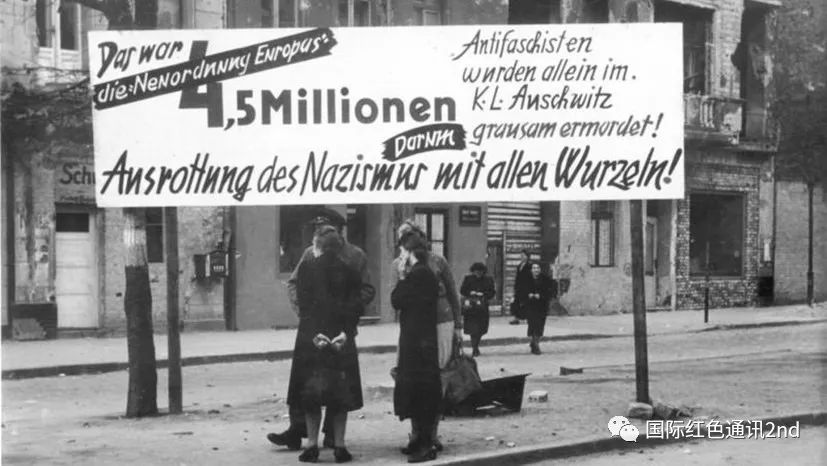 图:1945年夏关于奥斯维辛集中营的反法西斯海报,其中提及了布痕瓦尔德誓言(- 来源:联邦档案馆)(内容大致为“这就是‘欧洲新秩序’,为此仅仅在在奥斯维辛集中营就有450万[译者注:奥斯维辛集中营的遇难者数量实际上可能是110-150万人,450万人也可能是指纳粹各集中营的遇难者数量]反法西斯主义者被残忍杀害“,最下方为著名的布痕瓦尔德誓言“根除纳粹”。)