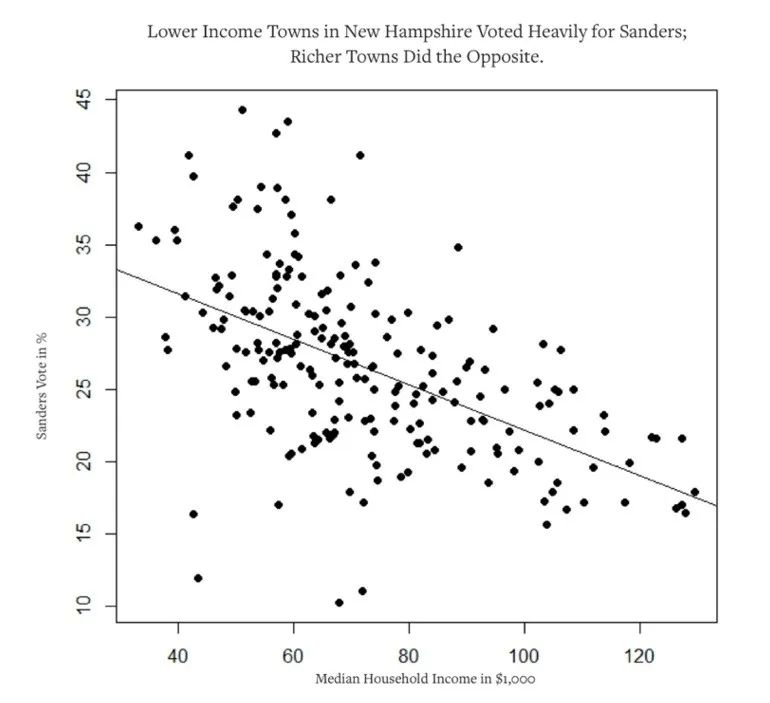 下面这张图概括了新罕布什尔州初选中的一个事实:城镇的收入和桑德斯的得票数之间的联系。我们认为,争取民主党提名的后续角逐,将会进一步证明这一关键事实。简单地说,一个城镇的收入越高,投给佛蒙特州参议员(译者注:指桑德斯)的票就越少。