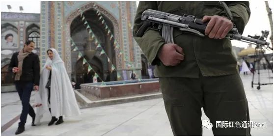 图:德黑兰一处投票站外的武装士兵