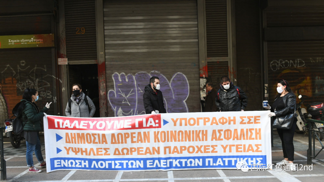 图:希腊会计联合会(federation of Accountants of Greece)、阿提卡地区会计控制人员联合会(Union of Accountant Controllers of Attica Region、领薪和自雇科研人员斗争委员会(Struggle Committees of Salaried and Self-Employed Scientists)在劳工和司法部(Ministries of Labour and Justice)门前的示威