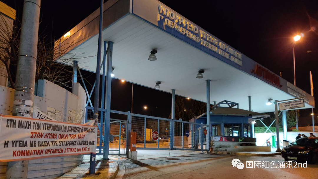 图:希腊共产党在医院、工厂和居民区悬挂的条幅,为人民传递着关于团结和诉求的信息:保护人民健康,保障劳工权利。