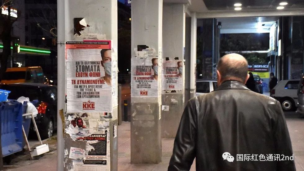 图:海报被张贴在希腊各大城市的中心地区,向人们传递希腊共产党乐观和战斗的信号。海报内容为:即使嘴被遮住,我们也要发出声音——我们要求加强对工人健康与权利的保护措施。