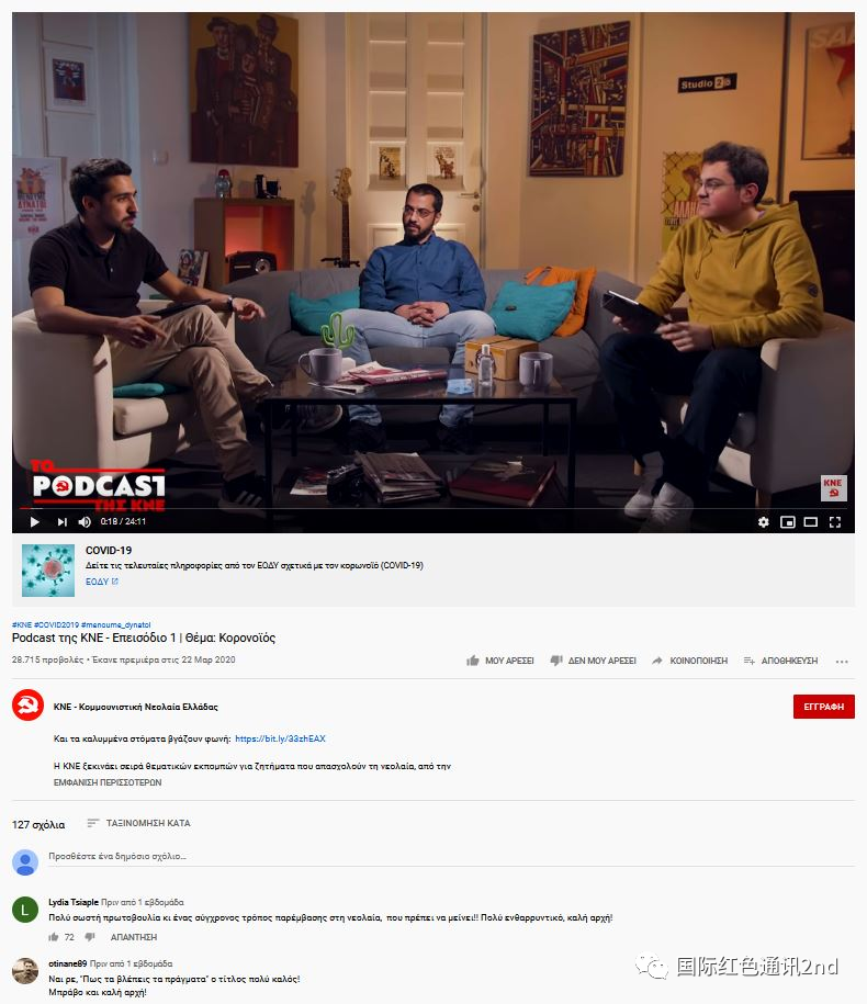 在共青团的网站上,我们开设了一个栏目:“我们保持坚强——在共青团的提议下‘逃离’”,其中展示了共青团节日活动的戏剧表演、儿童戏剧表演和音乐会以及一些新作品,这些都是党和共青团在雅典的希腊共青团文化与青年创作中心(Center of Culture and Youthful Creation of ΚΝΕ)和车间举办的活动。最近,我们党的网站上线了一项视觉艺术展览的虚拟游览,这是一项关于政治犯在监狱和流放地抵抗活动的展览。希腊共产党中央委员会(原计划)于3月在线下组织该展览,但是因为冠状病毒(疫情的影响)而暂停。此外,通过我们的网站,我们还展示了艺术家自己发送给我们的视频,介绍了他们的作品——以歌曲的形式推动反抗、诉求和团结。