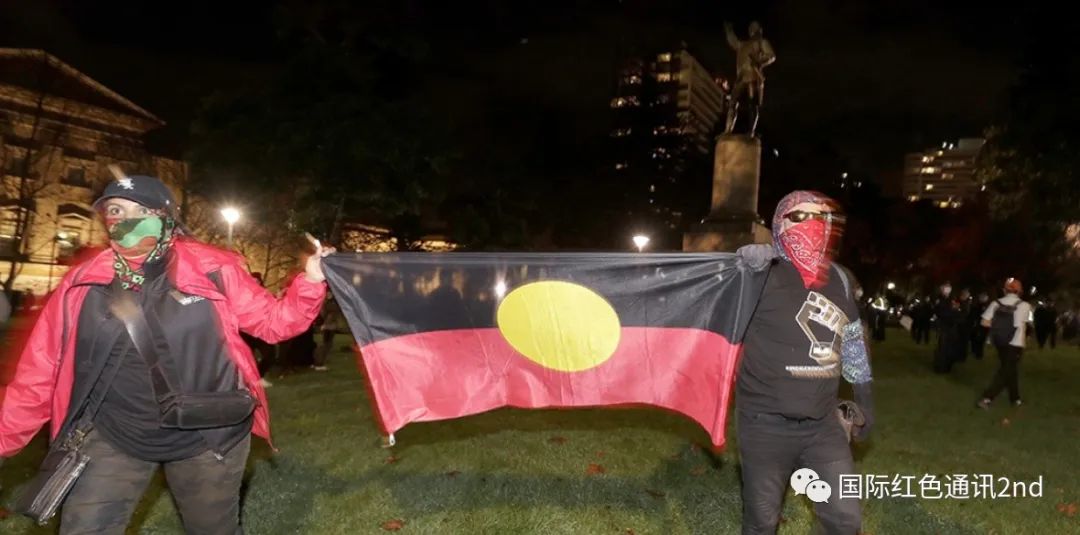 图:抗议者持土著旗帜,走过位于悉尼的英国探险家詹姆斯·库克船长的雕像。