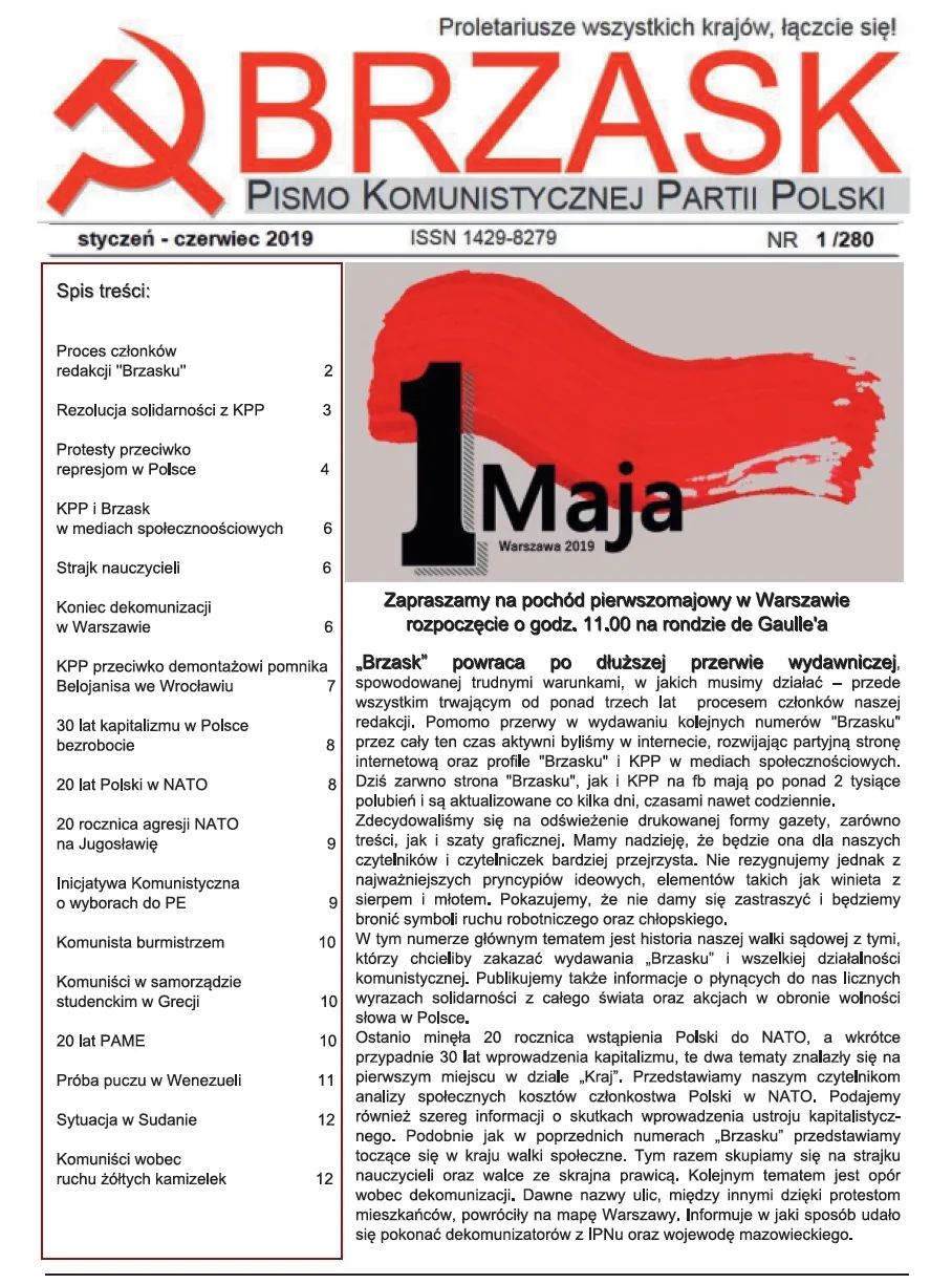 我们的党报《黎明报》(Brzask)的编辑部成员正面临审判。他们被指控“鼓吹极权制度”,因为他们发表了主张社会革命的文章和第二次世界大战前波兰共产党的一些历史材料。检察官提到的指控之一是,《黎明报》发表了正面介绍了十月革命和苏联的文章。审判已经进行了4年多。法庭两次宣告被告无罪。然而,检察官提出上诉,案件于(2020年)3月3日恢复审理。