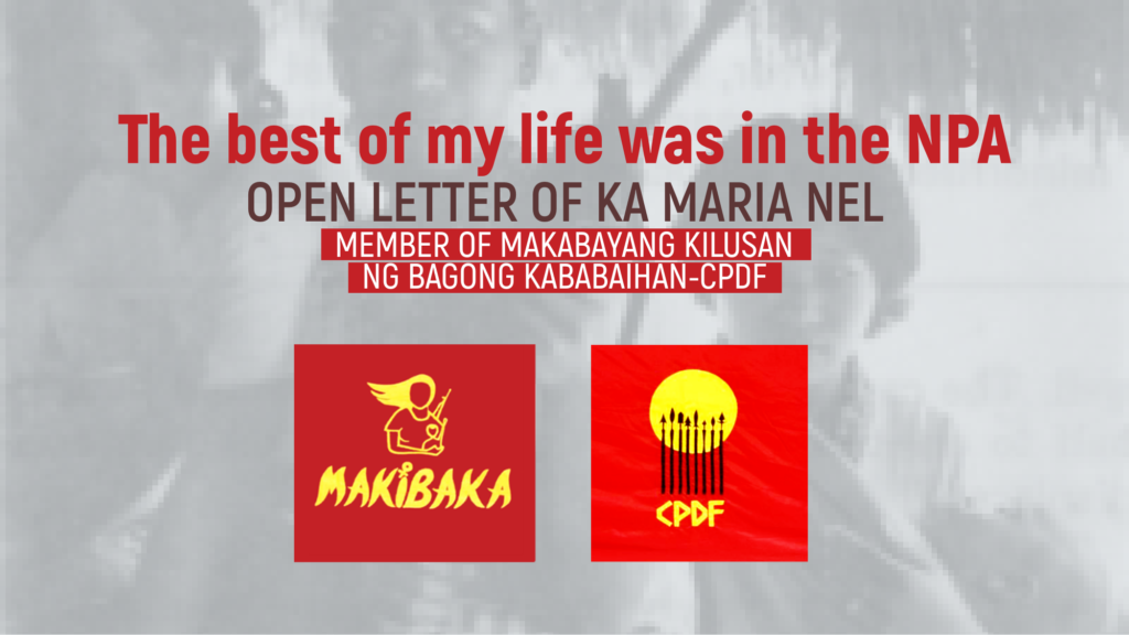 我20多岁的时候加入了新人民军,那时我还正年轻。现在我已经50多岁了。我不愿离开新人民军,不愿放弃新人民军的红色战士身份,但是我在菲律宾共产党和新人民军的组织为我安排了其他重要的革命工作。今天我已经离不开红色军队了,因为在我看来,我在那里度过了人生最美好的时光。把青春投入为人民服务的武装斗争,是我人生中的一个里程碑。因此,我认为新人民军使我的人生更充实,而不是像你们在“前叛乱分子的揭露”中说的,我们“在新人民军中悲惨地度过了一生”。你们说我们这些革命者是被误导的,正相反,我们是得到了真正的启发,找到了菲律宾人民通向自由、民主和幸福生活的正确道路。我出生并成长于美国—马科斯(Marcos)政权法西斯独裁时期。菲律宾人民把马科斯赶下台,伪装成亲人民、亲民主的科拉松·阿基诺(Cory Aquino)政权又取而代之。那时,我是一个被社会的腐朽所惊醒的青年学生。那时,我还梦想着成为教授或是律师,也渴望过成为国际战地记者。但是我放弃了这些理想,因为我明白了,全心全意地投入革命,可以更好地为我的同胞们服务。