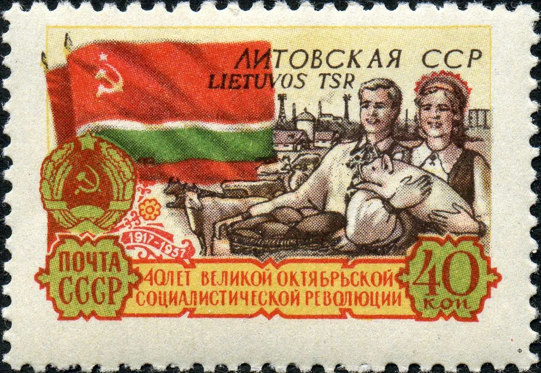 图:立陶宛苏维埃社会主义共和国纪念十月革命40周年的邮票(印有国旗、国徽)