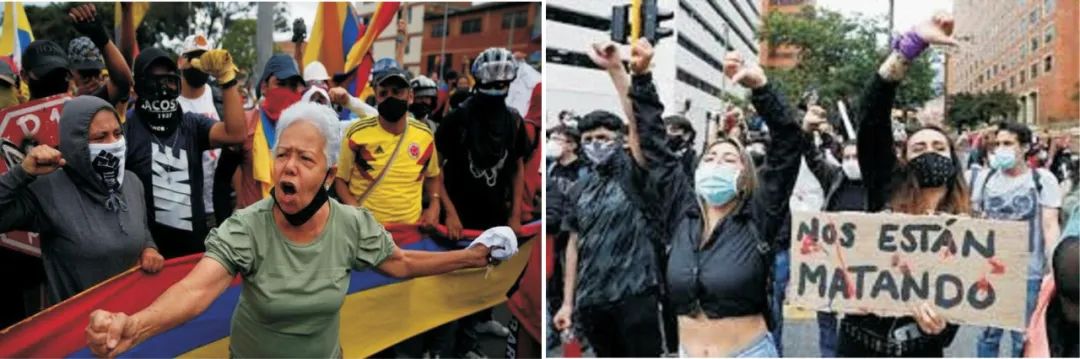 正如社交网络上流传的那些视频证明的那样,警察和机动镇暴部队(ESMAD)对示威者开枪、驱逐、碾压,并折磨与杀害那些参与斗争的人们。他们试图压制住因反对杜克政府无理要求而早已爆发出的震荡——这个政府就是乌里韦的傀儡(他是美洲大陆上最嗜血的家伙)(译注:乌里韦于2002年至2010年担任哥伦比亚总统),它负责在血与火中实施国际货币基金组织的计划,其中包括奴役工人的劳工改革以及养老金和税制改革,使人们陷入悲惨的境遇。而大资本家可以免税,从国家获得巨大的利益和补贴。同时所有的政府机构都存在着腐败和抢劫行径。