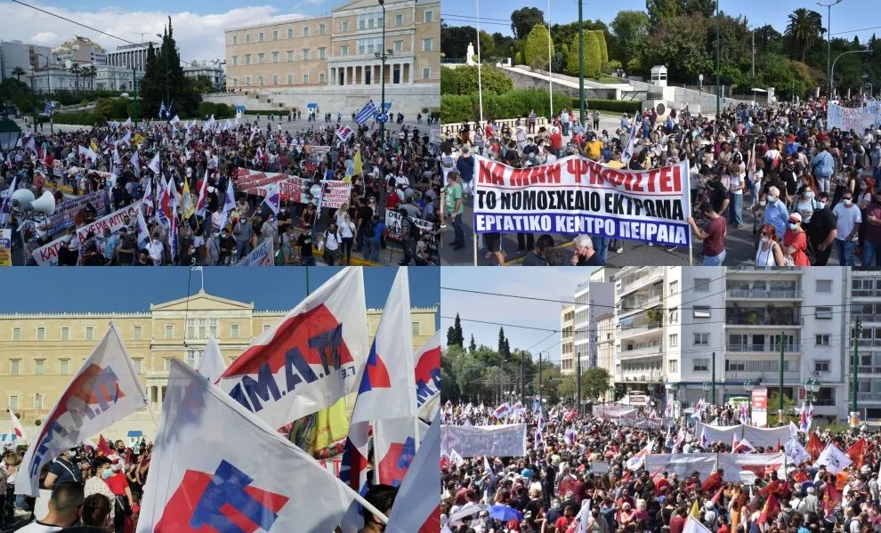 2021年6月16日星期三,成千上万的人们在雅典、塞萨洛尼基、帕特雷(译注:希腊前三大城市)和其他大城市举行示威,谴责废除8小时工作制和侵犯工会权利的罪恶的综合性劳动法。