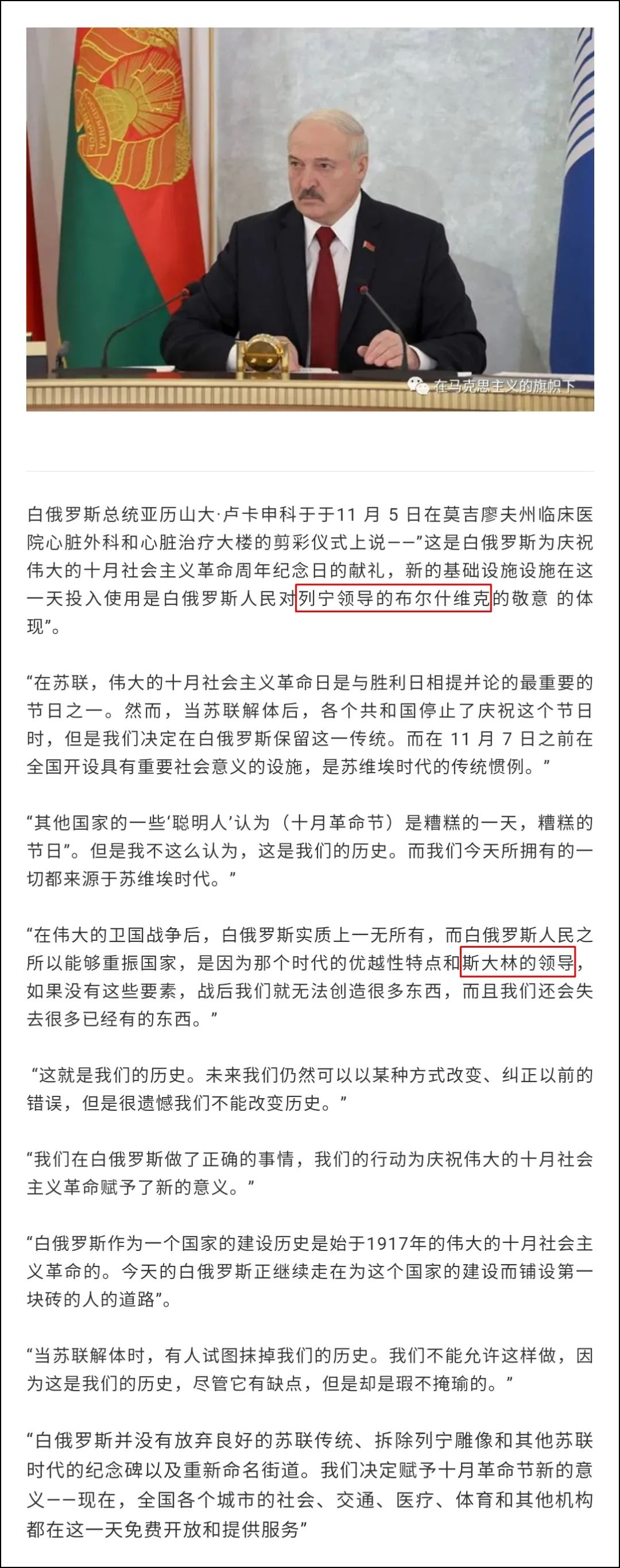 文中说,白俄罗斯总统卢卡申科11 月 5 日在莫吉廖夫州某医院大楼的剪彩仪式上高度评价了列宁、斯大林、布尔什维克,如下图: