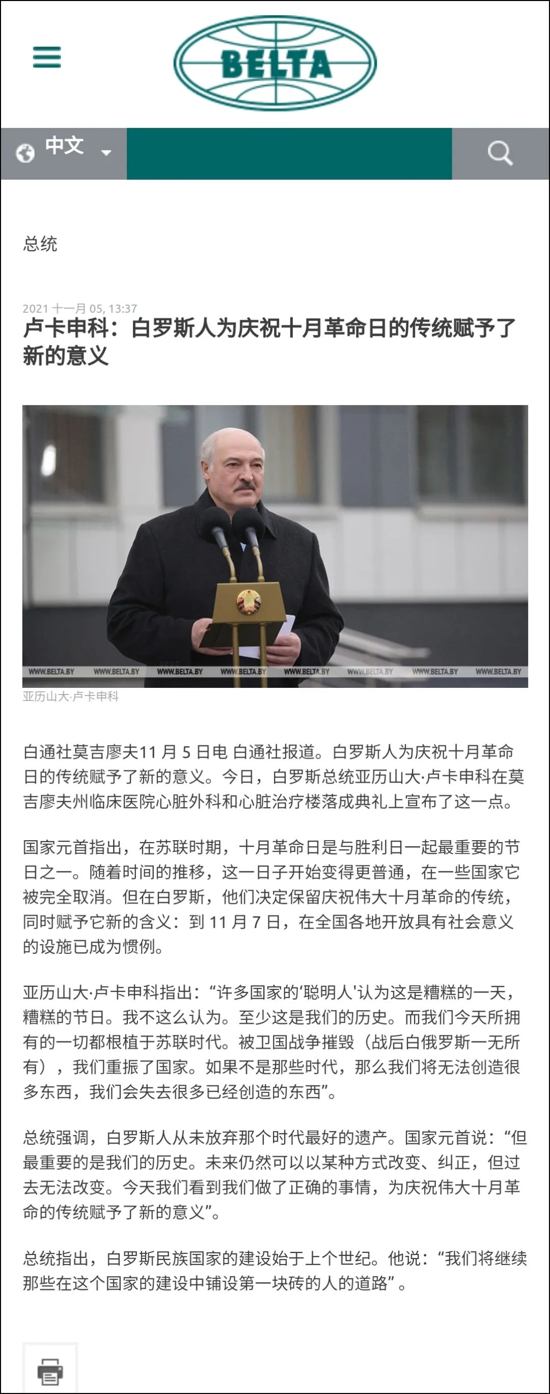 经查证,白俄罗斯国家通讯社和俄新社均对此次活动做了报道,白俄罗斯电视台还公布了卢卡申科总统的讲话视频。但无论文字报道(俄文及中文版)还是讲话视频,均对列宁、斯大林、布尔什维克只字未提。