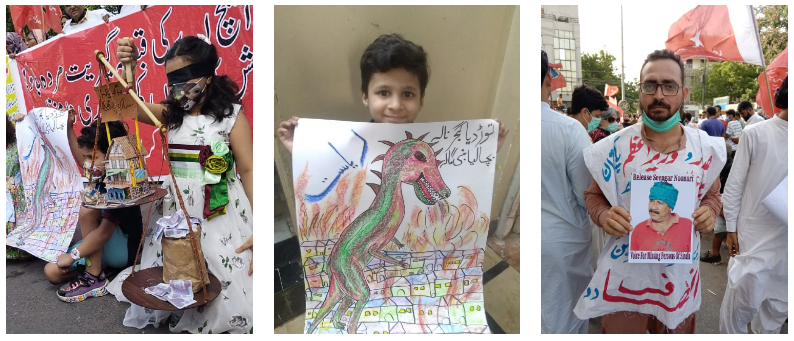 抗议者高举写有他们要求的横幅和标语牌,高呼口号,反对因巴维亚城镇公司和卡拉奇国防区房管局以及其他诸如古贾尔努拉高速公路(Gujjar Nullah expressway)、拉瓦尔品第环城公路(Rawalpindi Ring Road)、达多查大坝(Dadhocha dam)和拉维城市发展局(Ravi Urban Development Authority)等大型项目造成数千原住民流离失所的情况。