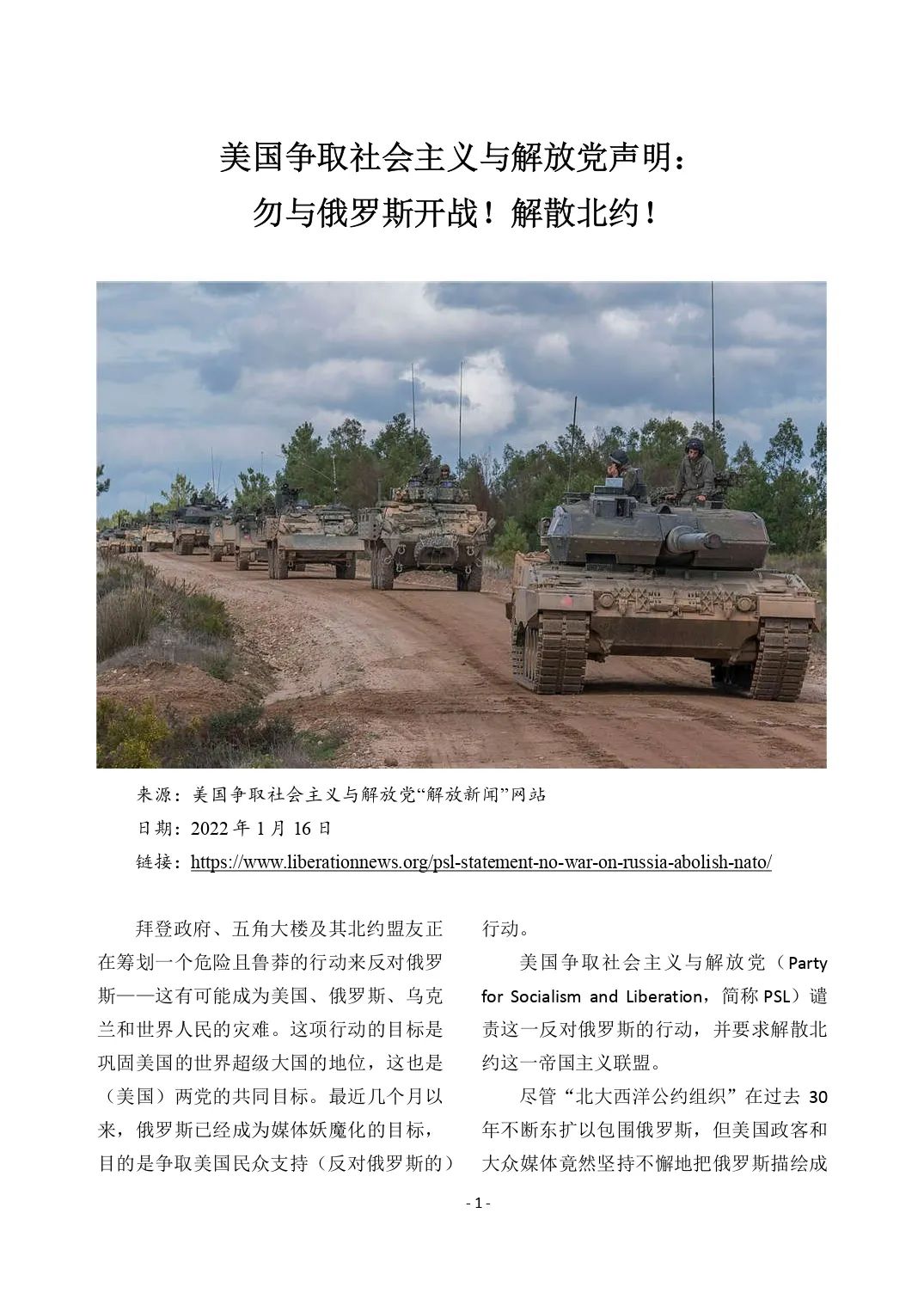 美国争取社会主义与解放党声明:勿与俄罗斯开战!解散北约!IRN 2022-02-14 约 80 字 预计阅读 1 分钟 目录 原文链接:https://www.liberationnews.org/psl-statement-no-war-on-russia-abolish-nato/
