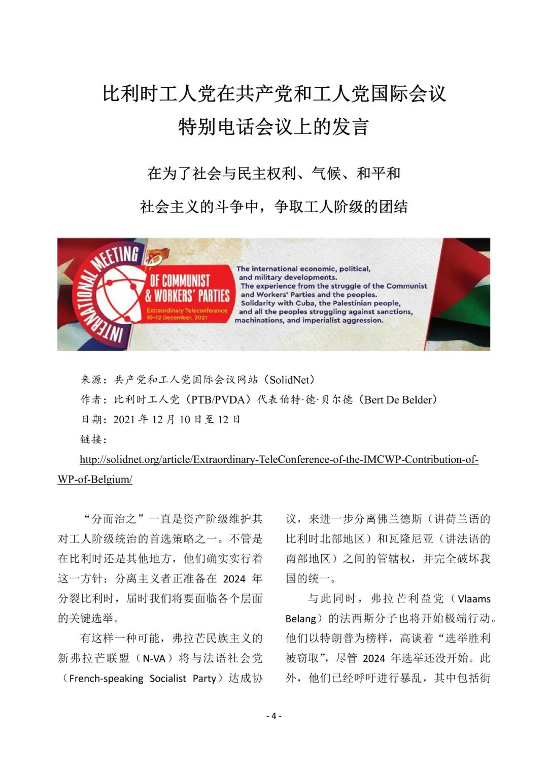 比利时工人党在共产党和工人党国际会议特别电话会议上的发言IRN 收录于 欧洲 2022-02-22 约 105 字 预计阅读 1 分钟 目录 原文链接:http://solidnet.org/article/Extraordinary-TeleConference-of-the-IMCWP-Contribution-of-WP-of-Belgium/