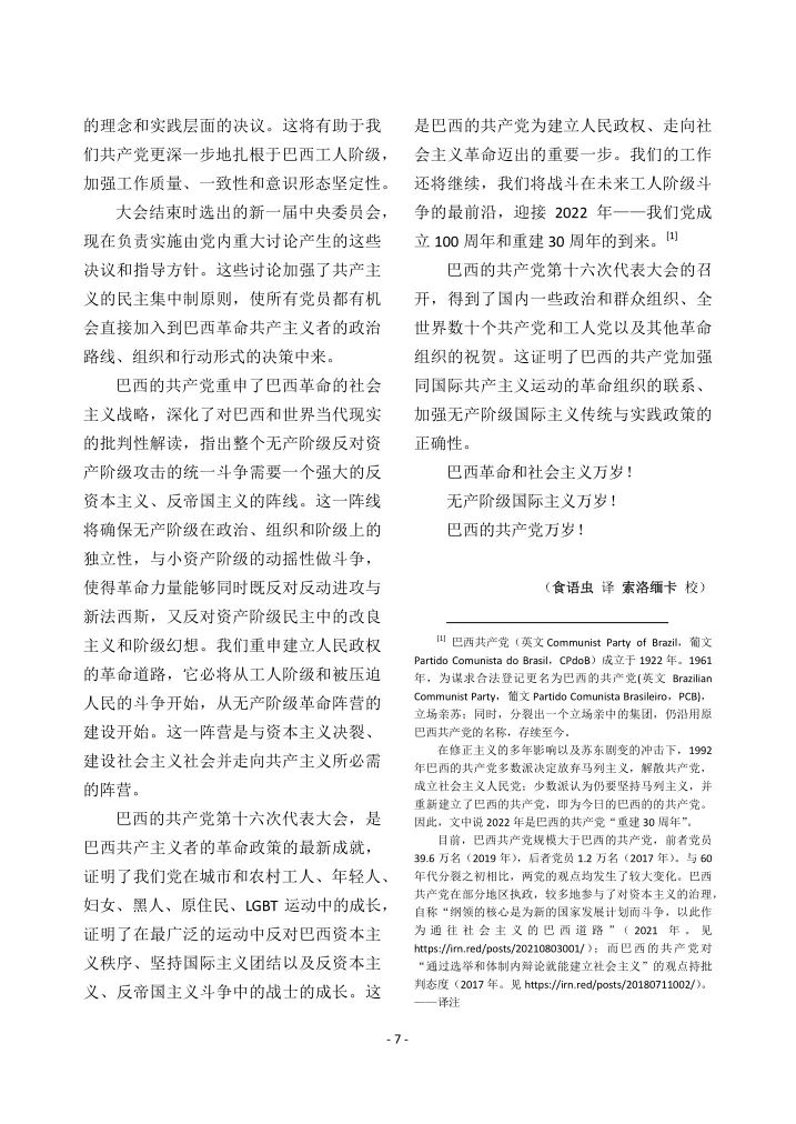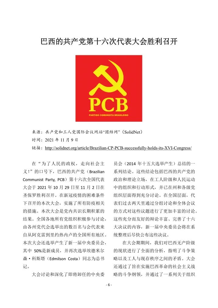 巴西的共产党第十六次代表大会胜利召开IRN 2022-03-01 约 86 字 预计阅读 1 分钟 目录 原文链接:http://solidnet.org/article/Brazilian-CP-PCB-successfully-holds-its-XVI-Congress/