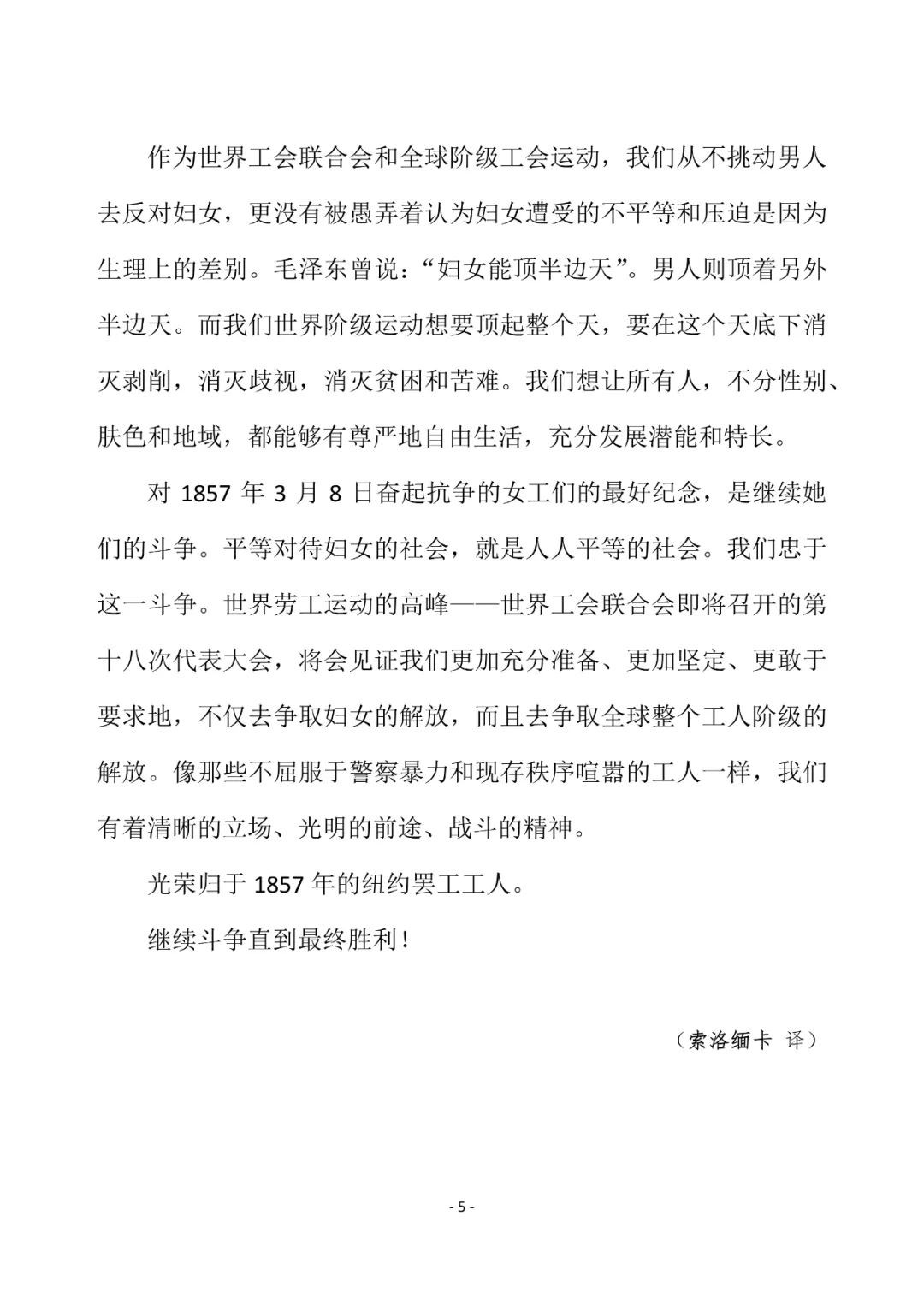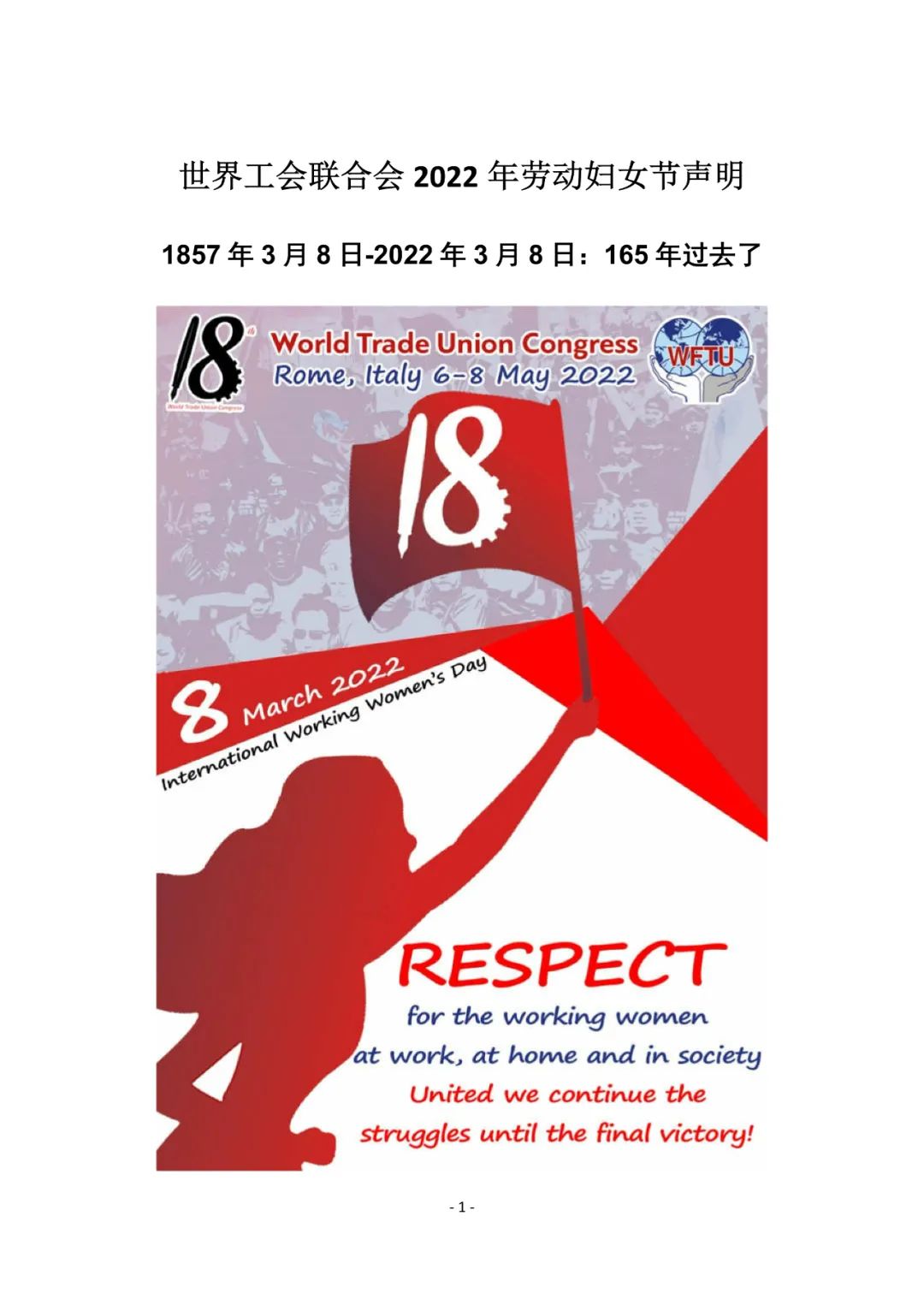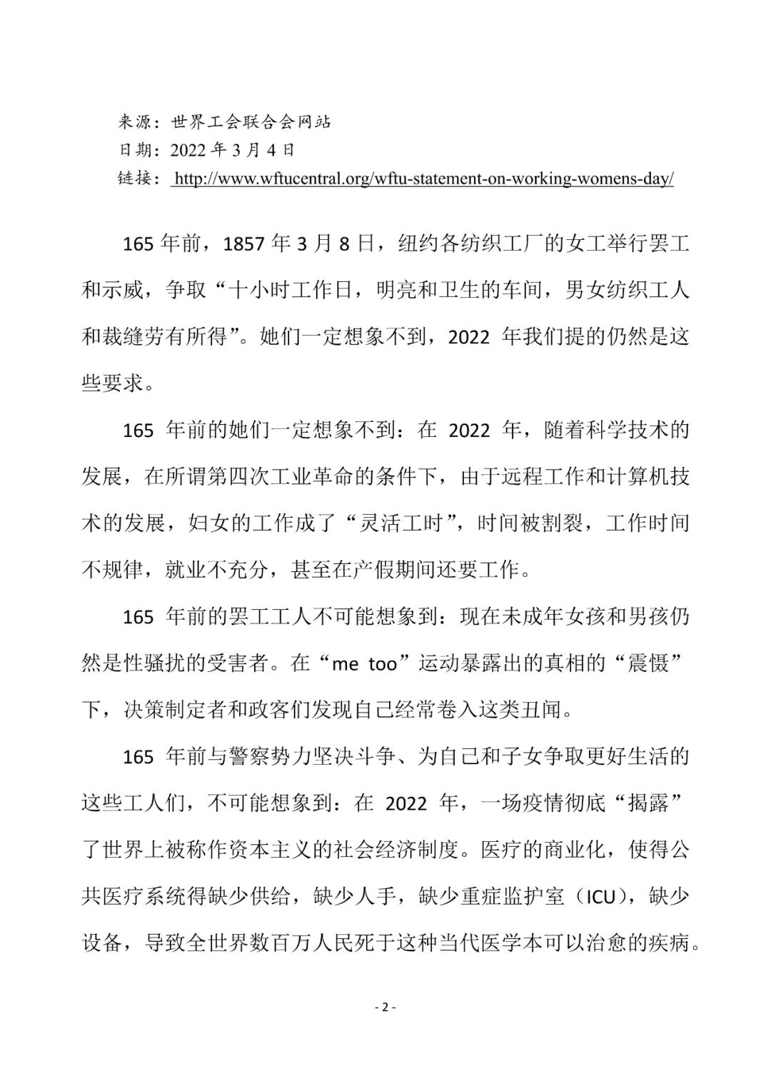 世界工会联合会 2022 年劳动妇女节声明IRN 收录于 亚洲 欧洲 北美洲 南美洲 非洲 大洋洲 2022-03-08 约 69 字 预计阅读 1 分钟 目录 原文链接:http://www.wftucentral.org/wftu-statement-on-working-womens-day/