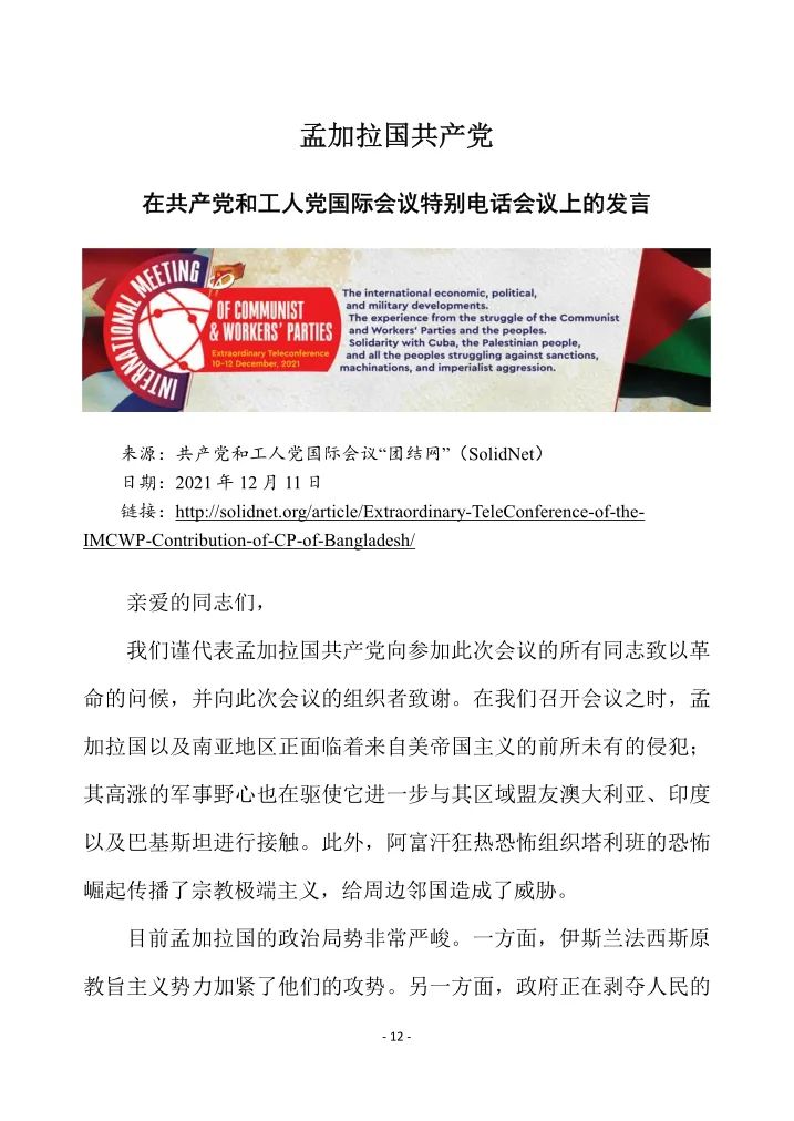 孟加拉国共产党在特别国际会议上的发言IRN 2022-03-16 约 108 字 预计阅读 1 分钟 目录 原文链接:http://solidnet.org/article/Extraordinary-TeleConference-of-the-IMCWP-Contribution-of-CP-of-Bangladesh/