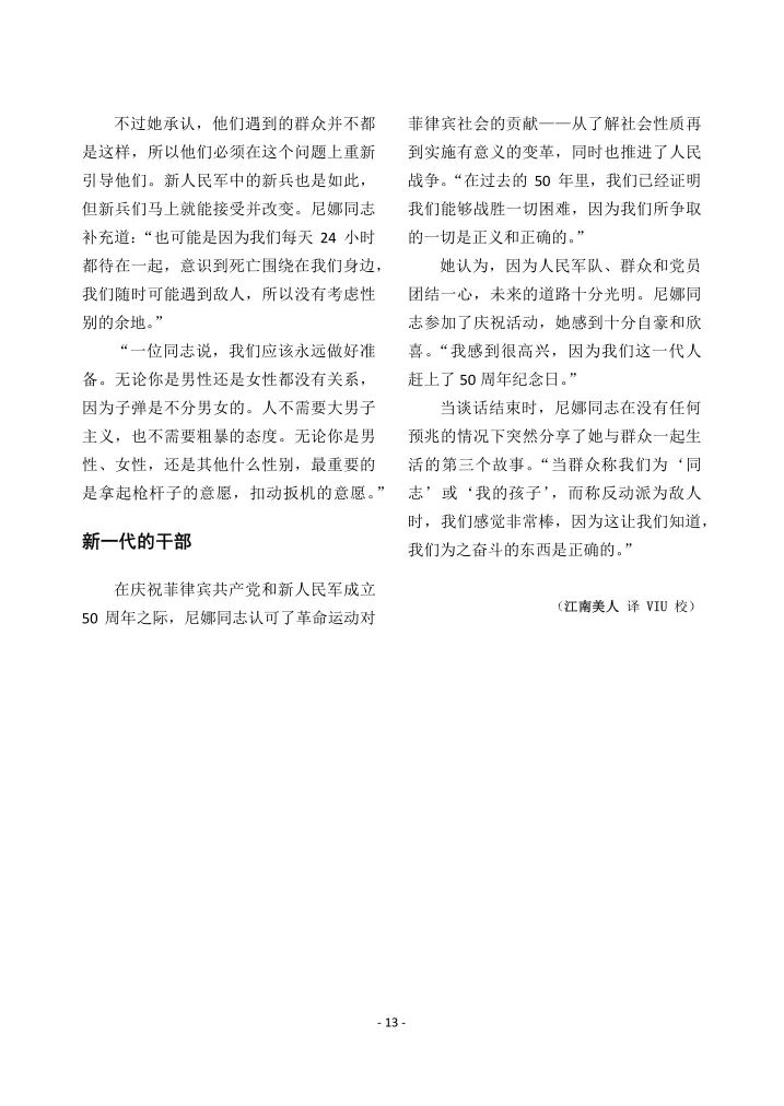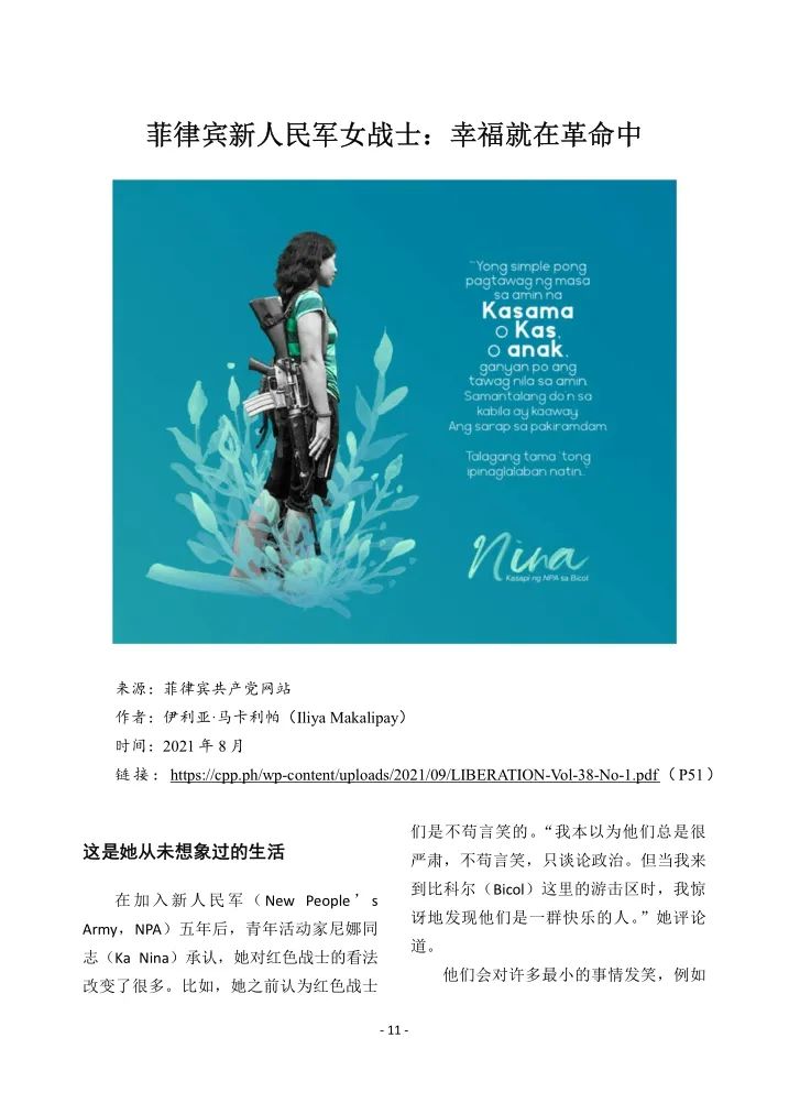 菲律宾新人民军女战士:幸福就在革命中IRN 2022-03-18 约 78 字 预计阅读 1 分钟 目录 原文链接:https://cpp.ph/wp-content/uploads/2021/09/LIBERATION-Vol-38-No-1.pdf(P51)