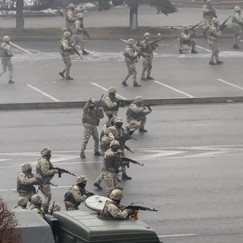 除警察之外,军队也被派遣去镇压人民。俄罗斯派出了所谓的“维和人员”。图片显示身着不明制服的不明军队在镇压群众。俄罗斯所谓的维和行动确保了自己在哈萨克斯坦原材料开采利益的安全。