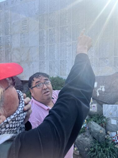 雷科莱塔也是圣地亚哥最大的公墓所在地,是智利大多数为工人阶级奋斗的战士们最后的安息之地。“你好同志”小组的成员们游览了国家公墓,并向那些为阶级斗争奉献出自己生命的战士们表达了敬意。大家首先前往纪念独裁统治时期失踪和被害人士的纪念馆。在一面约20英尺高、100英尺宽的巨型大理石墙上,写着法西斯政权统治下所有死难者的名字。在智利的日常生活中,独裁统治的悲剧仍然存在。死难者的亲属在参观纪念碑时,向我们指出了自己家人的名字。事实上,一片为失踪者建造的墓地与这块大纪念碑相邻,因为全国各地仍然不断发现死难者的遗骸,他们将会被安葬在这片墓地。