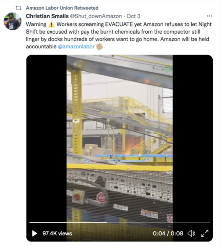 2022年10月3日下午晚些时候,亚马逊位于纽约州斯塔滕岛(STATEN ISLAND)的JFK8仓库的分拣中心发生了火灾。在预定的换班时间前,装卸码头的一台纸板压实机意外地燃烧了起来。大火扑灭后,当烟雾和刺鼻的化学物质还在空气中弥漫时,亚马逊管理层就要求仓库里上夜班的工人正常上班,尽管这些工人表达了对自己健康的担忧。